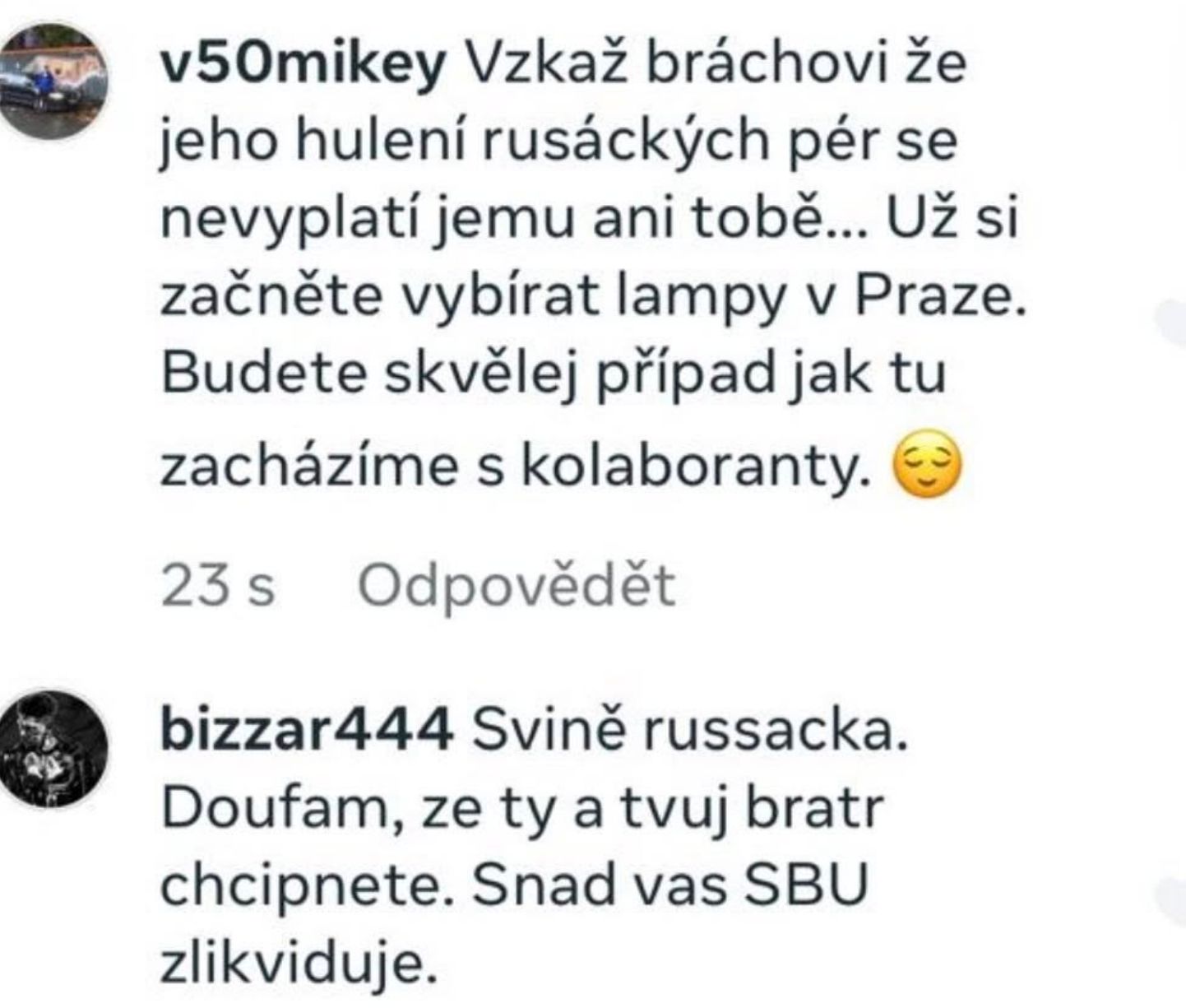 Další komentující pak napsal ještě ostřeji: „Svině rusácká. Doufám, že ty a tvůj bratr chcípnete. Snad vás SBU zlikviduje.“