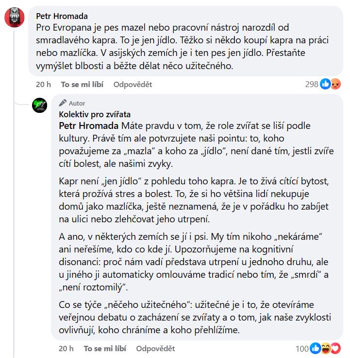 Někteří lidé však se srovnáváním psů a kaprů nesouhlasili. „Pro Evropana je pes mazel nebo pracovní nástroj na rozdíl od smradlavého kapra. To je jen jídlo. Těžko si někdo koupí kapra na práci nebo mazlíčka. V asijských zemích je i ten pes jen jídlo. Přestaňte vymýšlet blbosti a běžte dělat něco užitečného,“ podotkl jeden z komentujících.