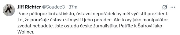 Jeden z diskutujících mu adresoval následující komentář: „Pane pětiopoziční aktivisto, ústavní nepořádek by měl vyčistit prezident. To, že porušuje ústavu, si myslí i jeho poradce, ale to vy jako manipulátor zvedat nebudete. Jste ostuda české žurnalistiky. Patříte k Šafrovi jako Wolner,“ vzkázal Moravcovi.