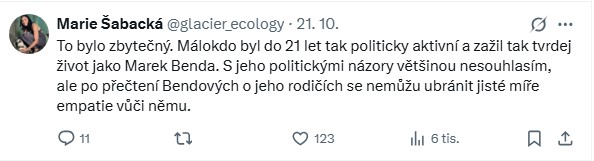 Jedna z komentujících k tomu uvedla: „To bylo zbytečný. Málokdo byl do 21 let tak politicky aktivní a zažil tak tvrdý život jako Marek Benda. S jeho politickými názory většinou nesouhlasím, ale po přečtení o jeho rodičích se nemůžu ubránit jisté míře empatie vůči němu,“ napsala uživatelka s tím, že i přes generační rozdíl by měla mladá politička projevit alespoň základní respekt k osobní historii starších poslanců.