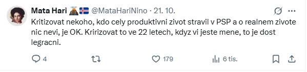 Další uživatelka reagovala podobně kriticky: „Kritizovat někoho, kdo celý produktivní život strávil v PSP a o reálném životě nic neví, je OK. Kritizovat to ve 22 letech, když ví ještě méně, to je dost legrační,“ napsala komentující.