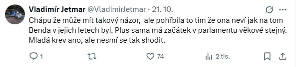 Další z komentářů se snažil situaci zasadit do širšího kontextu: „Chápu, že může mít takový názor, ale pohřbila to tím, že ona neví, jak na tom Benda v jejích letech byl. Plus sama má začátek v Parlamentu věkově stejný. Mladá krev ano, ale nesmí se tak shodit,“ uvedl diskutující, který i přes kritiku přiznal, že generační výměna ve Sněmovně je potřebná.