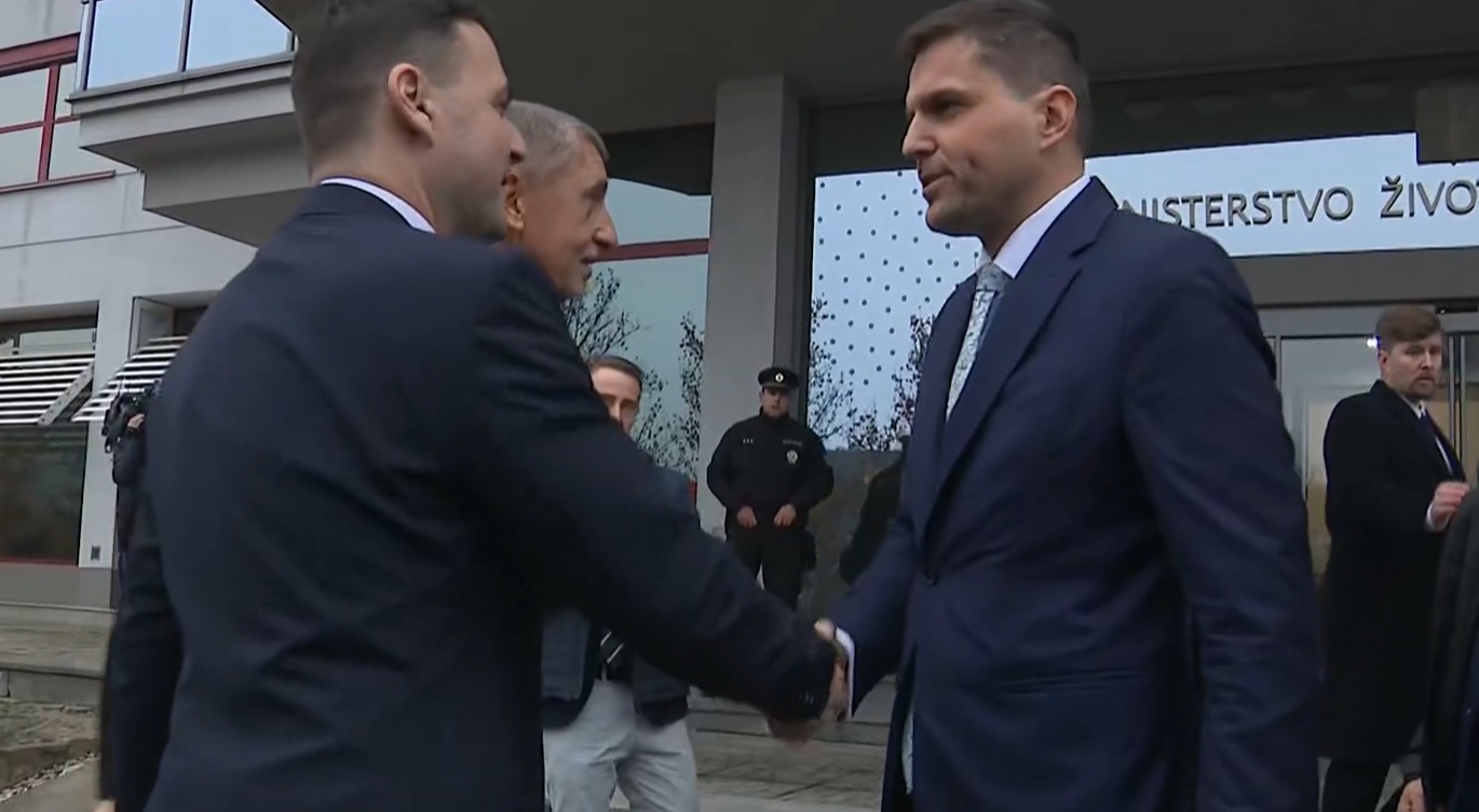 Deset minut po třetí hodině k ministerstvu přijíždí premiér s Macinkou. V obležení médií se nechali vyfotografovat, potřásli si rukou s Petrem Hladíkem, bývalým ministrem životního prostředí, a poté společně vstoupili do budovy.