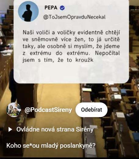 Nad otázkou, koho „se*ou mladý poslankyně“, s v podcastu Sirény zamyslela Linda Bartošová.„Možná máte trochu depku z povolebních výsledků, ale možná se radujete z jedné věci, a to sice z toho, že se do sněmovny dostal rekordní počet žen. Ne všichni se radují ani ve stranách, kde se tohle povedlo, jako například v Pirátské straně,“ sdělila moderátorka divákům a odcitovala některé z výroků z posledních dní.