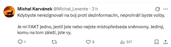 Další z uživatelů se pak ostře vymezil vůči Rakušanově politice v oblasti boje proti dezinformacím. „Kdybyste nerezignoval na boj proti dezinformacím, neprohráli byste volby. Je mi fakt jedno, jestli jste nebo nejste místopředseda sněmovny. Jediný, komu na tom záleží, jste vy.“