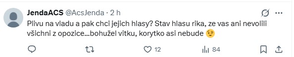 Uživatelé se rovněž podivovali, jaké reakce může Rakušan po svém veřejném vystupování očekávat. „Plivu na vládu a pak chci její hlasy? Stav hlasů říká, že vás ani nezvolili všichni z opozice. Bohužel, Vítku, korýtko asi nebude,“ zaznělo na jeho adresu.
