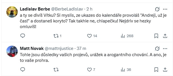 Jiný z komentujících Rakušanovi vzkázal, že podle něj nelze být současně morálním arbitrem i žadatelem o funkci. „A ty se divíš, Vítku? Si myslíš, že ukážeš do kalendáře, provoláš Andreji, už je čas, a dostaneš koryto? Tak takhle ne, chlapečku. Nejdřív se hezky omluvíš, jo?“