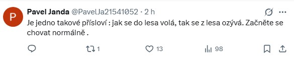 V diskuzi nechybělo ani lidové přísloví, kterým komentující reagovali na Rakušanovo rozhořčení nad výsledkem volby. „Jak se do lesa volá, tak se z lesa ozývá. Začněte se chovat normálně.“