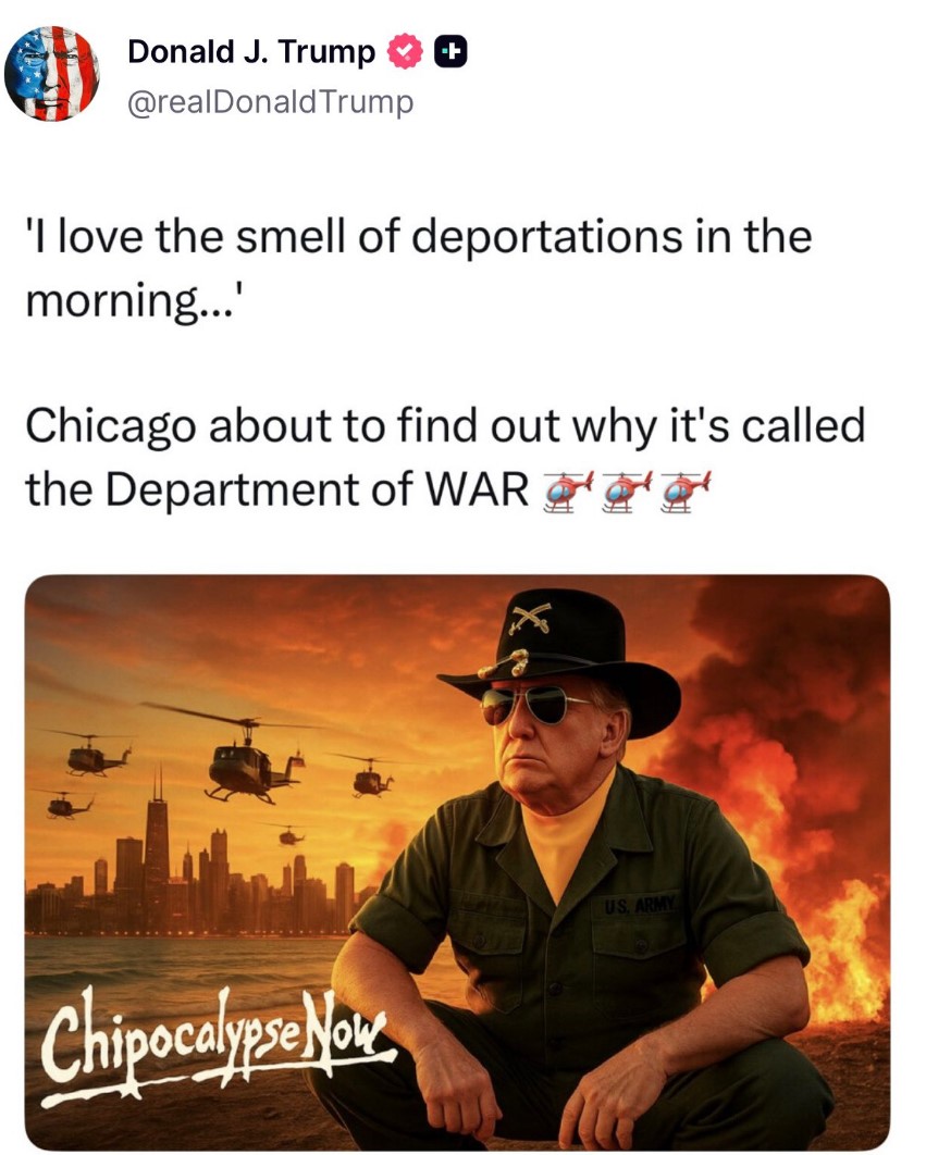 Americký prezident Trump v sobotu vyvolal rozruch, když pohrozil, že na Chicago nasadí „ministerstvo války“, učinil tak v příspěvku na sociální síti Truth Social, který připomíná film „Apokalypsa“. V textu napsal: „Miluji vůni deportací po ránu. Chicago již brzy pozná, proč jsme přejmenovali ministerstvo VÁLKY.“
