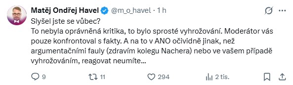 Reagoval také předseda TOP 09 Matěj Ondřej Havel. Vondráčkovi vzkázal, že nešlo o oprávněnou kritiku, ale o „sprosté vyhrožování“, zatímco moderátor jej podle něj pouze konfrontoval s fakty. „A na to v ANO očividně jinak, než argumentačními fauly (zdravím kolegu Nachera) nebo ve vašem případě vyhrožováním, reagovat neumíte…,“ napsal Vondráčkovi.