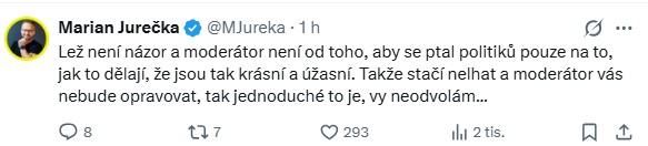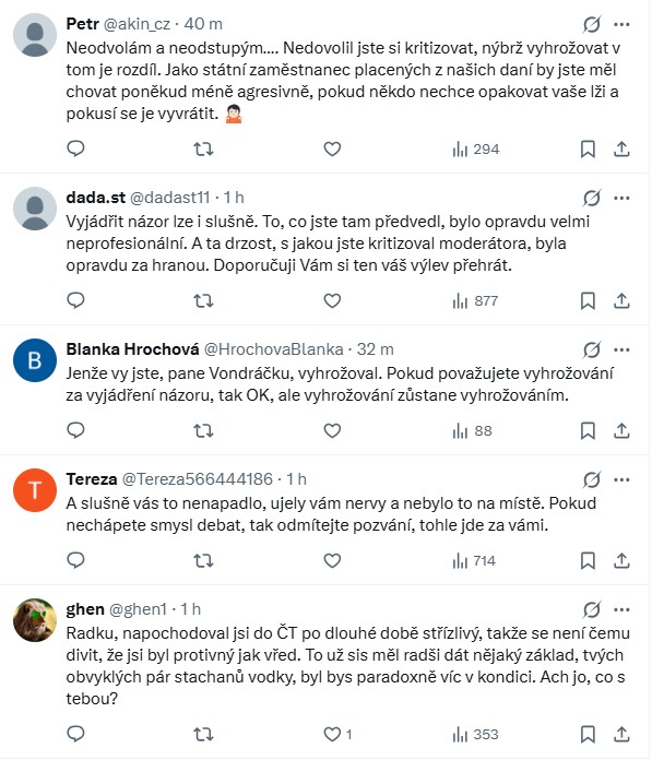 Podobně i mnozí uživatelé pod jeho příspěvkem vytýkali Vondráčkovi agresivní tón vůči moderátorovi Martinu Řezníčkovi a upozorňovali, že překročil hranici běžné politické polemiky.