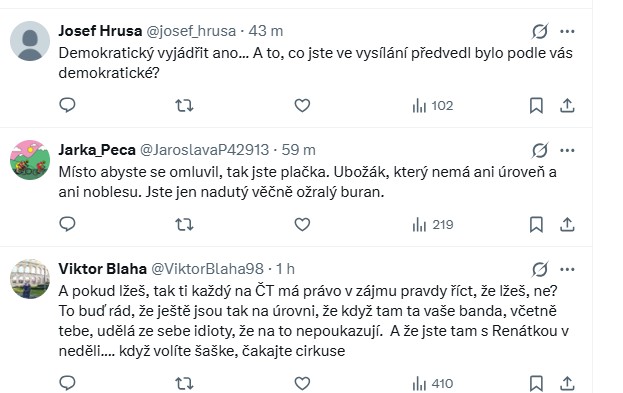 Jiná komentující mu vytkla, že místo sebereflexe volí další útok. „Místo abyste se omluvil, tak jste plačka,“ napsala ostře s tím, že očekávala spíše uznání chyby.