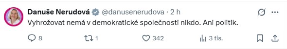 Přidala se také europoslankyně Danuše Nerudová (STAN), která stručně vzkázala, že „vyhrožovat nemá v demokratické společnosti nikdo. Ani politik,“ postavila se na stranu kritiků Vondráčkova vystupování v debatě.