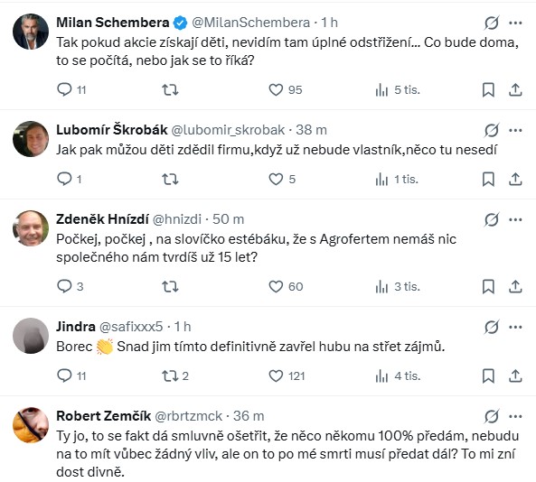 Objevovaly se i názory, že pokud akcie jednou přejdou na děti, nejde o úplné odloučení. „Co bude doma, to se počítá nebo jak se to říká,“ napsal jeden z diskutérů, zatímco další se ptali, „jak můžou děti zdědit firmu, když už nebude vlastník – na tom něco nesedí“.