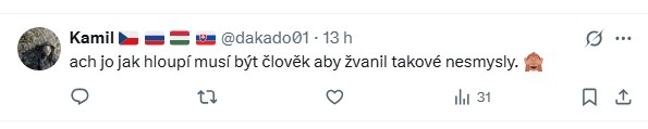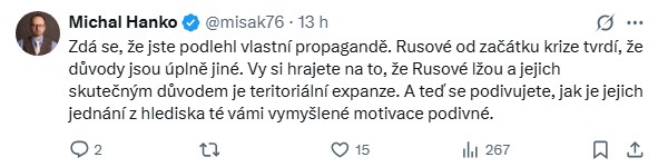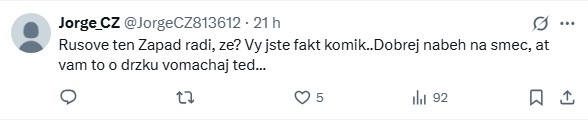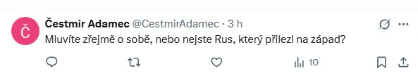 Na osobní rovinu přešla i část dalších reakcí. „Rusové ten Západ rádi, že? Vy jste fakt komik… Dobrej náběh na smeč, ať vám to o držku vomáchaj teď,“ obrátil další diskutér Mitrofanovu poznámku proti němu a zlehčil jeho kritiku ruské expanze.