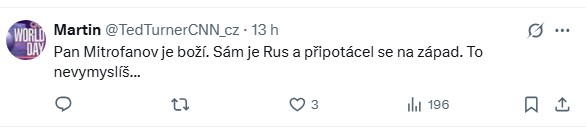 A rozvířené komentáře pod příspěvkem rychle přibývaly. Objevily se poznámky jako: „Pan Mitrofanov je boží, sám je Rus a připotácel se na Západ, to nevymyslíš.“