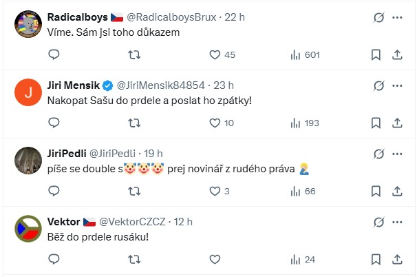 Alaxandru Mitrofanovi mnozí vzkazovali, aby opustil českou kotlinu: „Tak vysmahni“, nebo dokonce „Nakopat Sašu do prdele a poslat ho zpátky!“ a nechyběly ani další hrubé výpady jako: „Běž do prdele, Rusáku.“ Další diskutující připomínali Mitrofanovu novinářskou minulost s posměšnými narážkami typu: „Prej novinář z Rudého práva.“