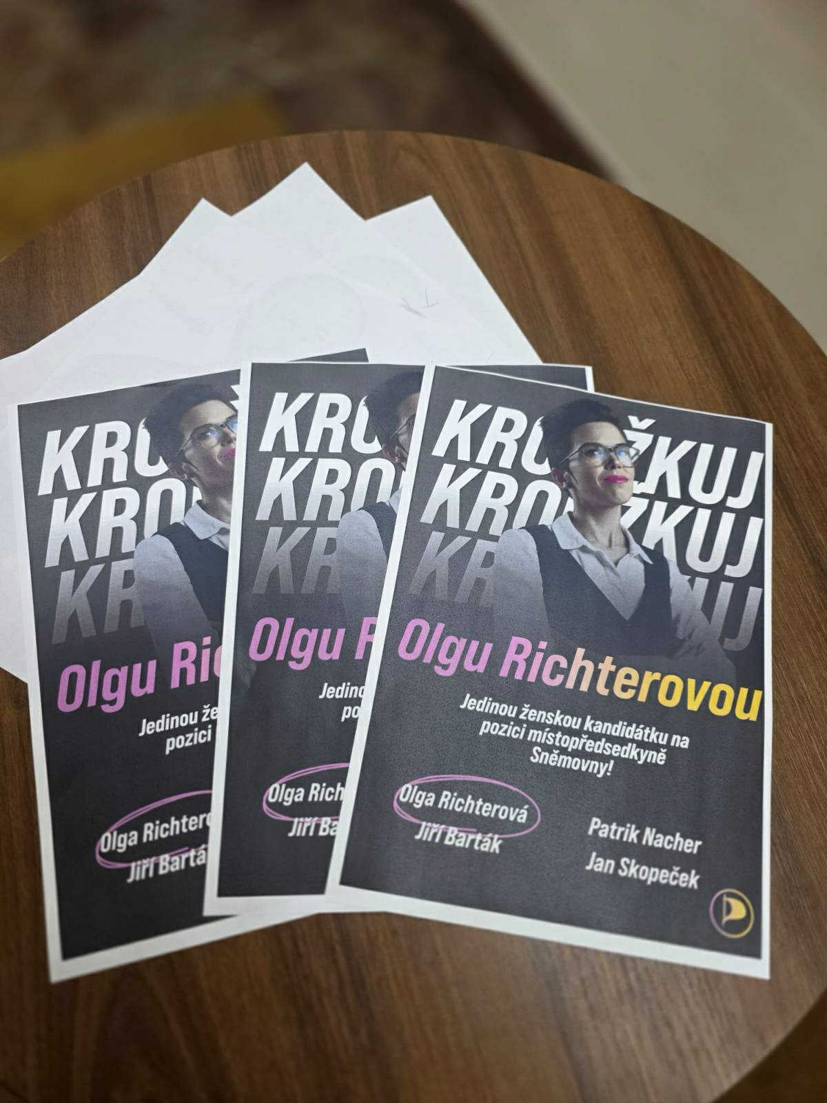 S letákem přispěchali i Piráti, kteří nabádají ke kroužkování Olgy Richterové, „jediné ženské kandidátky na pozici místopředsedkyně Sněmovny“. O funkci místopředsedy se ucházejí ještě Jiří Barták (Motoristé), Patrik Nacher (ANO) a Jan Skopeček (ODS).