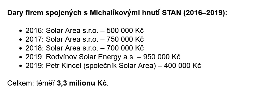 Peníze z Michalikových vazeb s ruskými podnikateli se v dalších letech objevují i na účtech hnutí STAN. Jak píší InFakta.cz, jen v letech 2016-2019 měly měly z Michalikových solárních firem přijít na stranický účet 3,3 miliony. O to zajímavější jsou pozdější performance hnutí STAN s Putinem v pytli na mrtvoly a podobně.