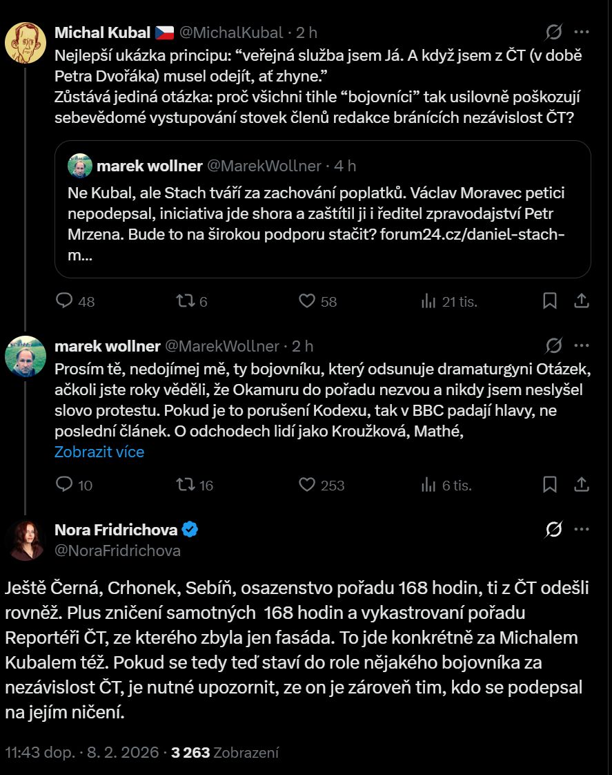 Zde se do debaty zapojila i další bývalá přední tvář publicistiky ČT, novinářka Nora Fridrichová. Ta pokračovala ve výčtu jmen dále: „Ještě Černá, Crhonek, Sebíň, osazenstvo pořadu 168 hodin, ti z ČT odešli rovněž. Plus zničení samotných 168 hodin a vykastrování pořadu Reportéři ČT, ze kterého zbyla jen fasáda. To jde konkrétně za Michalem Kubalem též. Pokud se tedy teď staví do role nějakého bojovníka za nezávislost ČT, je nutné upozornit, ze on je zároveň tím, kdo se podepsal na jejím ničení.“