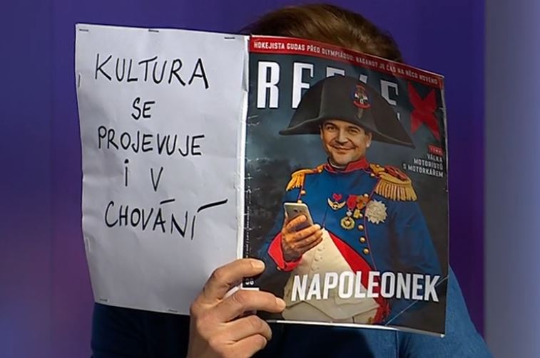 Herečka Zlatohlávková pak prohlásila, že má Maďary ráda, ale „pana Orbána“ určitě ne. „Až tak mě nezajímá toto téma,“ řekla a demonstrativně si otevřela list papíru s obálkou Reflexu, kde byl Petr Macinka jako Napoleon, a nápisem „Kultura se projevuje i v chování“. Což kamera pak ostentativně zabírala, zatímco hovořil Ladislav Jakl.