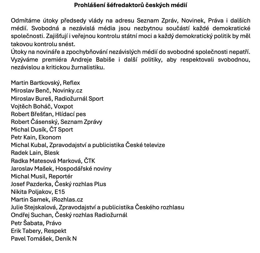 „Svobodná a nezávislá média jsou nezbytnou součástí každé demokratické společnosti. Zajišťují i veřejnou kontrolu státní moci a každý demokratický politik by měl takovou kontrolu snést,“ píší šéfredaktoři a končí výzvou premiéru Babišovi i dalším, aby respektovali svobodnou, nezávislou a kritickou žurnalistiku.