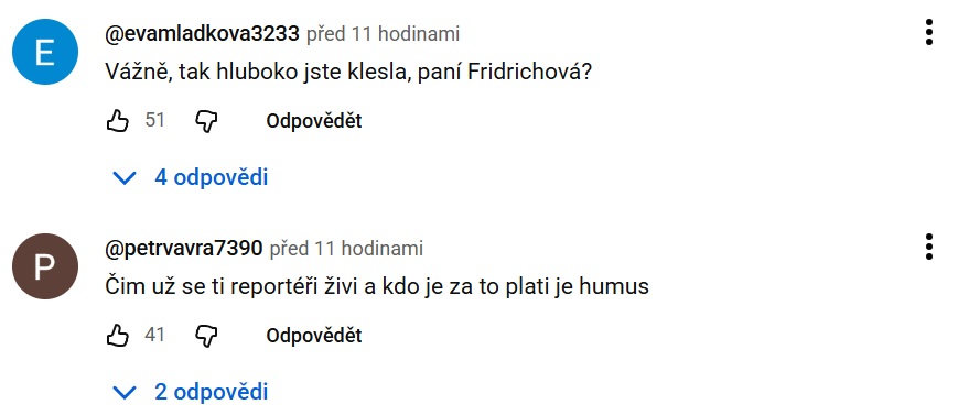 „Vážně, tak hluboko jste klesla, paní Fridrichová?“ ptala se uživatelka Eva a další z uživatelek dodala, že čím se novináři živí a kdo je platí, je „humus“.