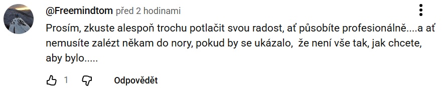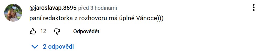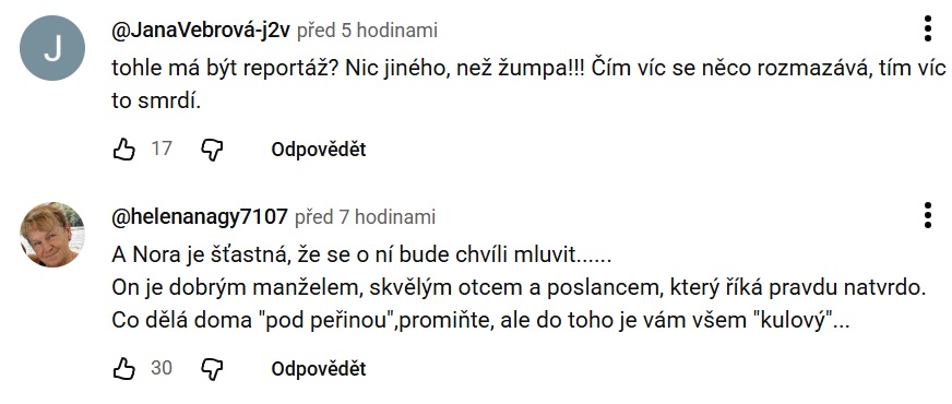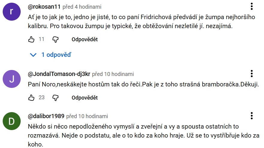 „A Nora je šťastná, že se o ní bude chvíli mluvit,“ přisadila si i uživatelka YouTube Helena, podle které je Rajchl dobrým manželem, otcem i poslancem, a co dělá „pod peřinou“, by nemělo být předmětem věci. Další uživatel zase podotkl, že novinářka Fridrichová má evidentně „úplné Vánoce“.