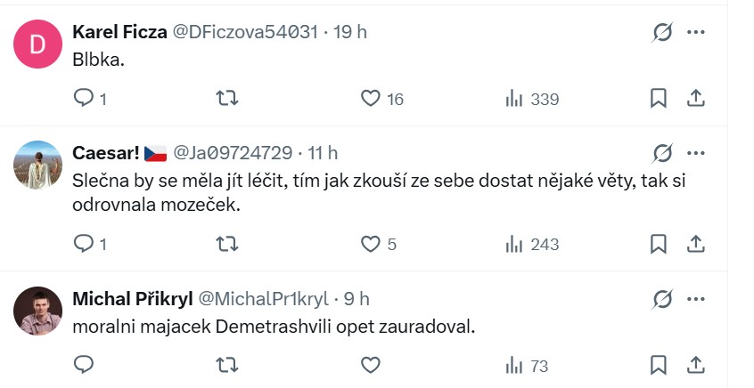 Jeden z diskutujících připojil sarkastickou poznámku na její osobu i politické postoje. „Morální majáček Demetrashvili opět zaúřadoval,“ uvedl.