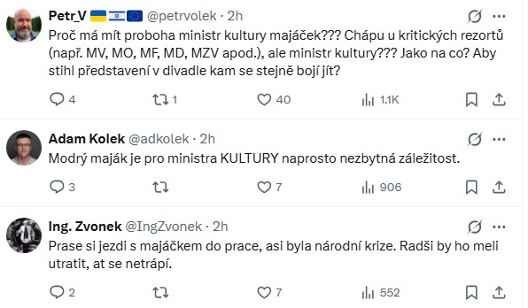 Část diskutujících se podivovala nad tím, proč má mít ministr kultury služební vůz s majáčkem, jeden z nich například pod příspěvkem Seznam Zpráv, které informovaly o nehodě, na síti X ironicky poznamenal, že snad aby „stihl představení v divadle, kam se stejně bojí jít“.