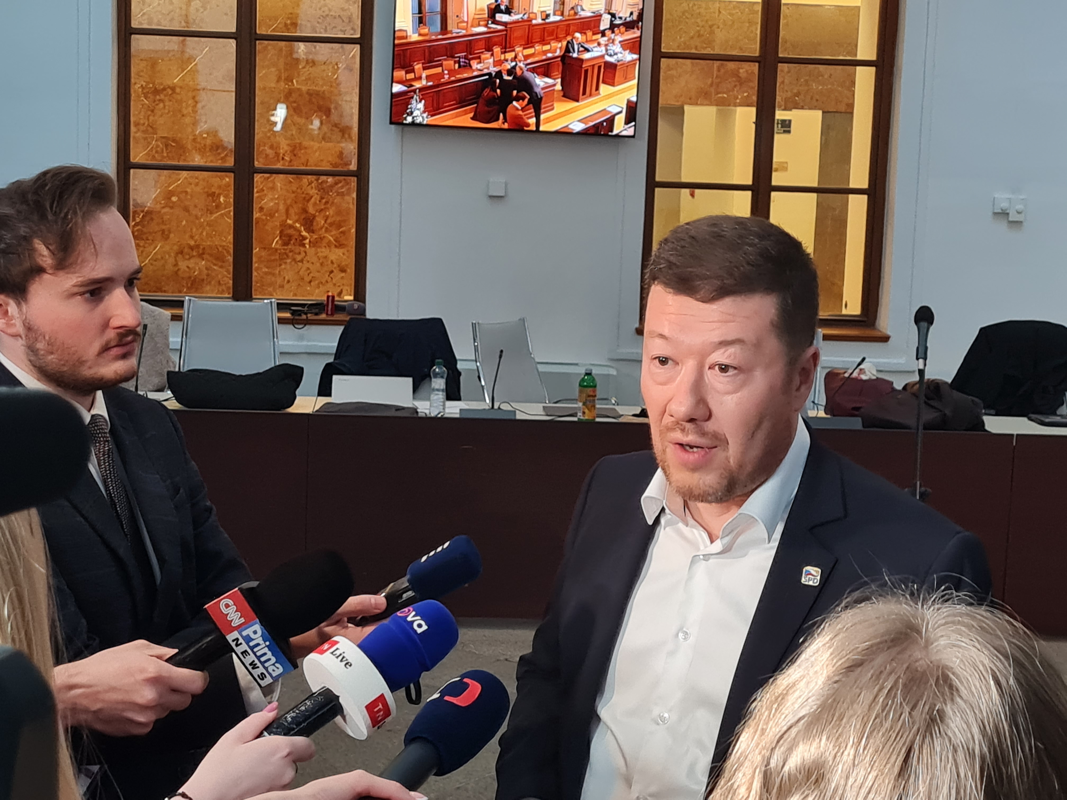 Tomio Okamura předal řízení schůze, přišel si dokument převzít a novinářům pak sdělil, že hlasování o nedůvěře proběhne příští úterý. Počítá ale s tím, že projednávání bude dlouhé a protáhne se do dalších dní.