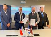 Popisek: Podpis smlouvy za účasti prezidenta OMNIPOL Group Jiřího Podpěry (vlevo) a generálního ředitele SiNAB Technologies Tonyho Landerse v Praze.
