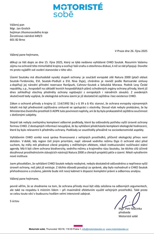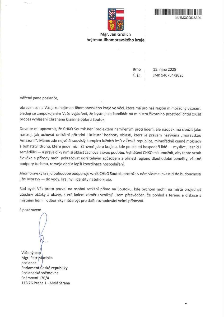 Předseda strany Motoristé sobě Petr Macinka zareagoval na otevřený dopis jihomoravského hejtmana Jana Grolicha (KDU-ČSL) z 15. října, v němž ho jako kandidáta na post ministra životního prostředí vyzval k osobní návštěvě a k dialogu o významu nově vyhlášené Chráněné krajinné oblasti (CHKO) Soutok.