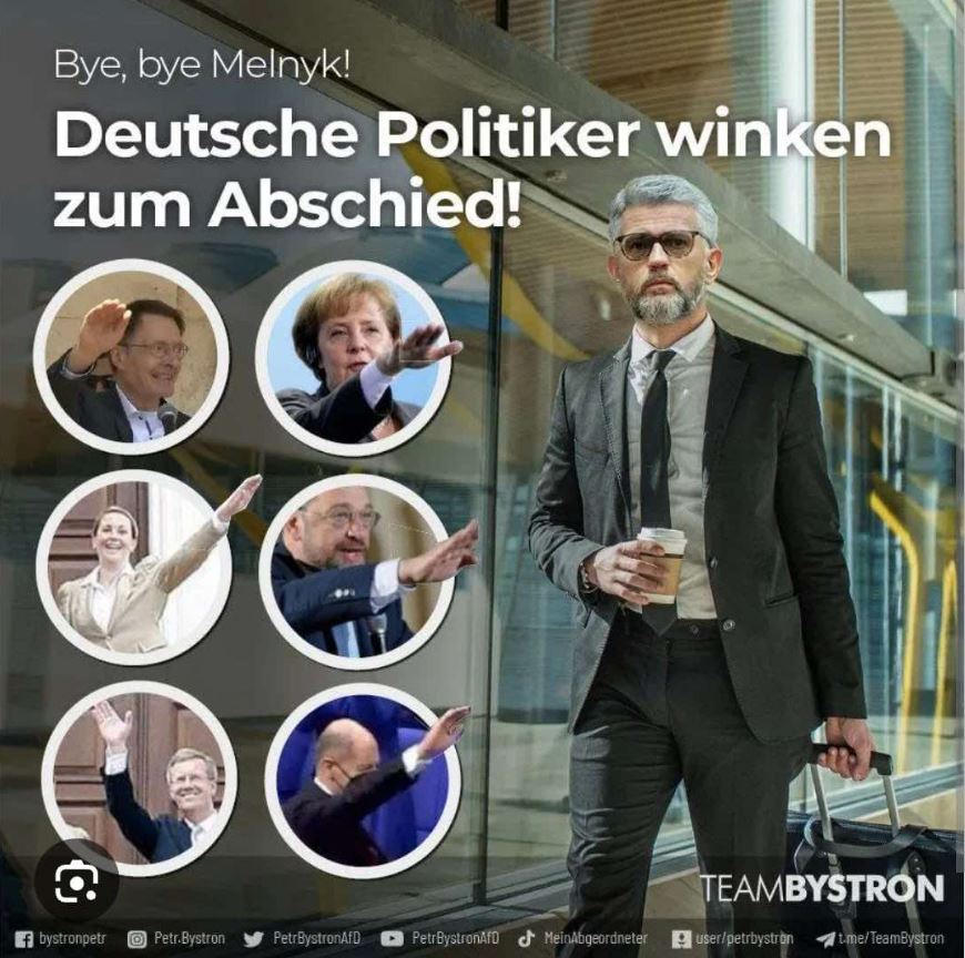Foto: Koláž sdílená Bystroněm s popiskem: „Měj se, Melnyku! Němečtí politici mávají na rozloučenou!“