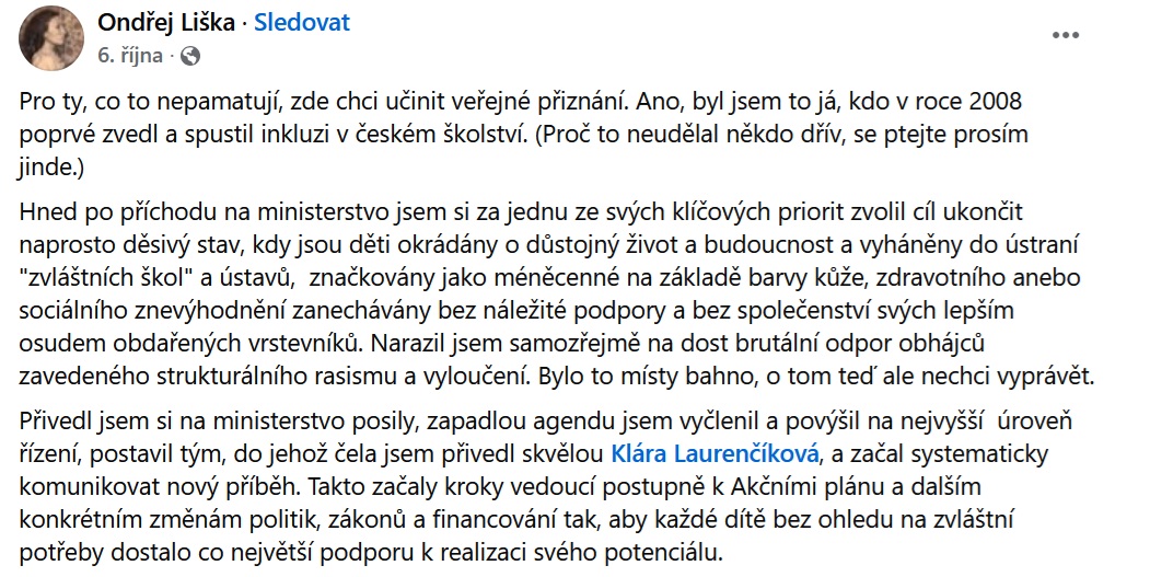 A někteří se pozastavovali také nad tím, že hlavní tvář české inkluze s manželem figuruje v projektu prestižní pražské soukromé školy s měsíčním školným deset tisíc korun, kam naopak dávali své děti rodiče, kteří o inkludované třídy nestáli.