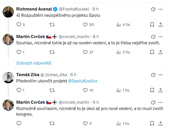 Někteří diskutující Cvrčkovu výzvu ještě rozšířili – Richmond Avenal navrhl jako čtvrtý bod rozpuštění neúspěšného projektu SPOLU. Na to Cvrček odpověděl s tím, že o případné budoucnosti koalice může rozhodnout až nové vedení, které je ale podle něj potřeba nejprve zvolit.