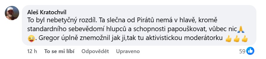 „To byl nebetyčný rozdíl. Ta slečna od Pirátů nemá v hlavě, kromě standardního sebevědomí hlupců a schopnosti papouškovat, vůbec nic. Gregor úplně znemožnil jak ji, tak tu aktivistickou moderátorku,“ reagoval na příspěvek Mallotové uživatel facebooku Aleš.