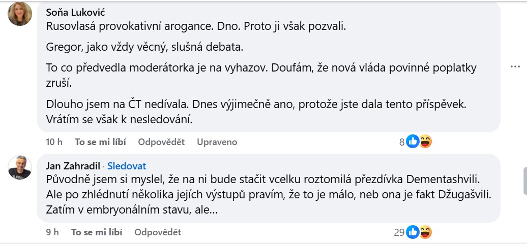 „Rusovlasá provokativní arogance. Dno. Proto ji však pozvali. Gregor, jako vždy věcný, slušná debata. To, co předvedla moderátorka, je na vyhazov. Doufám, že nová vláda povinné poplatky zruší,“ zhodnotila debatu na České televizi uživatelka Soňa.
