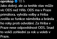 Na příspěvek reagoval i předseda pražského ANO Ondřej Prokop, podle nějž za to kromě Hřiba může i ODS, která ho neodvolala. „Jako dobrý, ale za tenhle stav může víc ODS než Hřib. ODS má v Praze primátora, vyhrála volby a Hřiba zvolila do funkce náměstka a bránila ho roky proti odvolání. Za Hřiba v Praze nese odpovědnost ODS. Snad to voliči zohlední za rok u voleb v Praze,“ doufá Prokop.