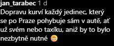 Objevila se ale i celá řada příspěvků, podle kterých mohou za kolony samotní řidiči. „Dopravu kurví každý jedinec, který se po Praze pohybuje sám v autě, ať už svém nebo taxíku, aniž by to bylo nezbytně nutné,“ tvrdí někteří.