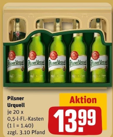 Basa dvaceti plzní stojí v letáku platném od dnešního dne pouhých 13,99 eura. Společně se zálohou 3,10 eura zákazník zaplatí v přepočtu 415 korun (17,09 eura). I kdyby Čech nevracel přepravku a lahve kvůli záloze, přijde ho jedna půllitrová plzeň při nákupu v Německu na necelých 21 korun. Kdo do Německa jezdí opakovaně a má možnost zavézt vratné obaly při příštím nákupu s sebou, zaplatí za lahev plzeňského piva jen necelých 17 korun (0,7 eura).