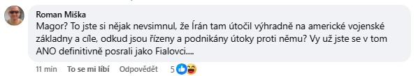 Jeden z diskutéru Babiše upozornil, že podle něj Írán útočil primárně na americké vojenské cíle v regionu a že šlo o odvetnou reakci na předchozí údery proti íránským cílům. „Magor? To jste si nějak nevšimnul, že Írán tam útočil výhradně na americké vojenské základny a cíle, odkud jsou řízeny a podnikány útoky proti němu? Vy už jste se v tom ANO definitivně posrali jako Fialovci...,“ popustil uzdu emocím.