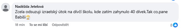 Babišův postoj, který je vnímán jako jasné postavení se na stranu Izraele v širším regionálním konfliktu, však vyvolal ostré reakce. V komentářích pod jeho příspěvkem se objevují emotivní a často i útočné příspěvky.