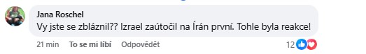 Jedna z komentujících se Babiše otevřeně zeptala: „Vy jste se zbláznil? Izrael zaútočil na Írán první, tohle byla reakce,“ napsala pod jeho příspěvek. Podobné reakce se v debatě objevovaly opakovaně a poukazovaly na to, že část veřejnosti vnímá íránské údery jako odvetu za předchozí izraelské kroky.