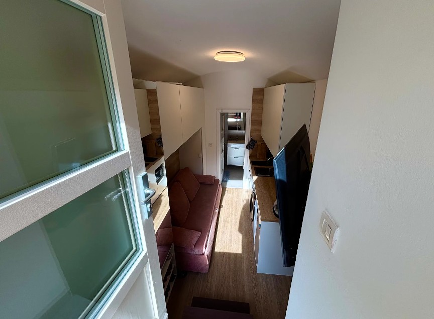 Zájemci, kteří požadují prestižnější lokalitu, si mohou vybrat mikrobyt v Holešovicích. Prostor o rozloze 15 m² sice není dle platných předpisů bytem, ale bydlet se v něm dá. Do prostoru ve sníženém přízemí se vstupuje po schodech ze dvora činžovního domu. Obydlí, připomínající tvarem nudli, má kuchyňskou linku, rozkládací gauč, skříň, televizi, toaletu a sprchový kout. „Nemovitost je ideální jako investice, případně dostupné startovací bydlení pro singl nebo mladý pár,“ láká zájemce realitní makléř. Prostor se prodává s cenovkou 3 miliony 199 tisíc korun. Za metr čtvereční mikrobytu v Holešovicích to vychází na 213 tisíc korun.