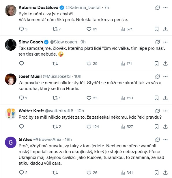 Objevily se i reakce, které zpochybňovaly samotnou výtku o „studu“. Jeden z komentujících se podivil, proč by se měl někdo stydět za potlesk projevu, který podle něj jen popisuje realitu.