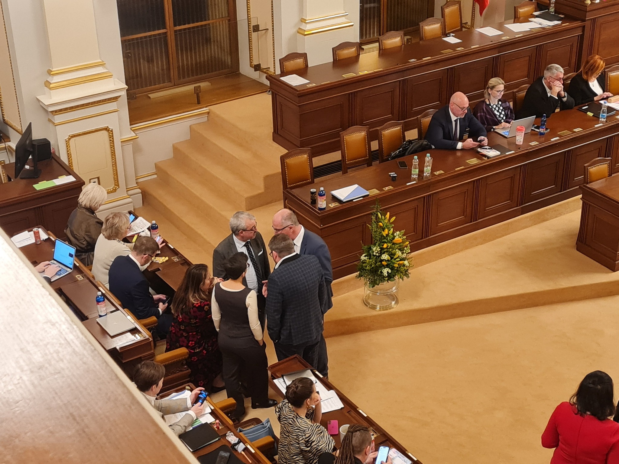 Důvod obsáhlejšího projevu se jevil zřejmým: čtvrthodinka posloužila ke shromáždění všech poslanců do sálu. Hlavně těch opozičních, koaliční byli v lavicích rychleji. Nakonec se naposledy poradili Marek Benda, Jan Jakob, Tom Philip, Michaela Šebelová a Olga Richterová a šlo se na věc.