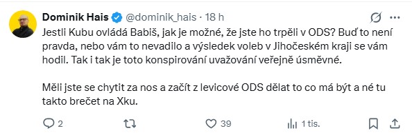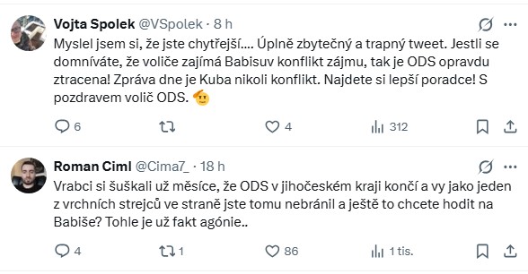 Další reagující připomněl, že tvrzení o tom, že Martina Kubu ovládá Andrej Babiš, nedává logiku. Pokud by to byla pravda, pak se ptá: „Jak je možné, že jste ho v ODS tolik let trpěli?“ a dodal, že výsledky voleb v Jihočeském kraji ODS zjevně nevadily. Podle něj je takové „konspirování úsměvné“ a uzavřel výzvou, že by se strana měla „chytit za nos a začít z levicové ODS dělat to, co má být“, místo brečení na sociální síti.