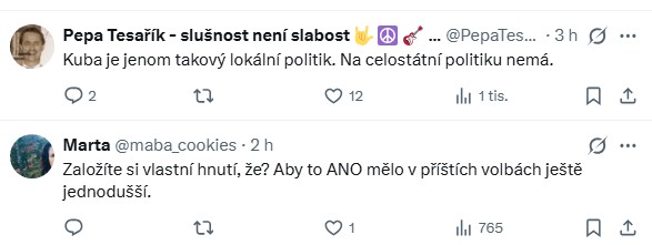 Během čtvrteční mimořádné schůze Sněmovny Martina Kubu zmiňoval předseda hnutí ANO Andrej Babiš. Jeden z uživatelů sítě X proto nyní spekuloval, že nové hnutí Martina Kuby by mohlo sehrát roli mostu mezi ODS a ANO. „Vsadím se, že hejtman Kuba sebere přeběhlíky z ODS a budou kolaborovat s Babišem. Babiš tomu udělal předpolí při tom včerejším blábolení. Ví totiž, že s tou tlupou poloopic z SPD a moto nemá šanci. Takhle se krásně spojí s “kmotry” z ODS, které tak “nenávidí”,“ uvedl.