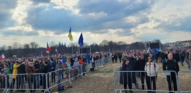 V davu jsou vidět nejen české vlajky, ale ve výrazné míře také symboly Evropské unie a Ukrajiny. Někteří účastníci dorazili i v tričkách s přeškrtnutým Andrejem Babišem.